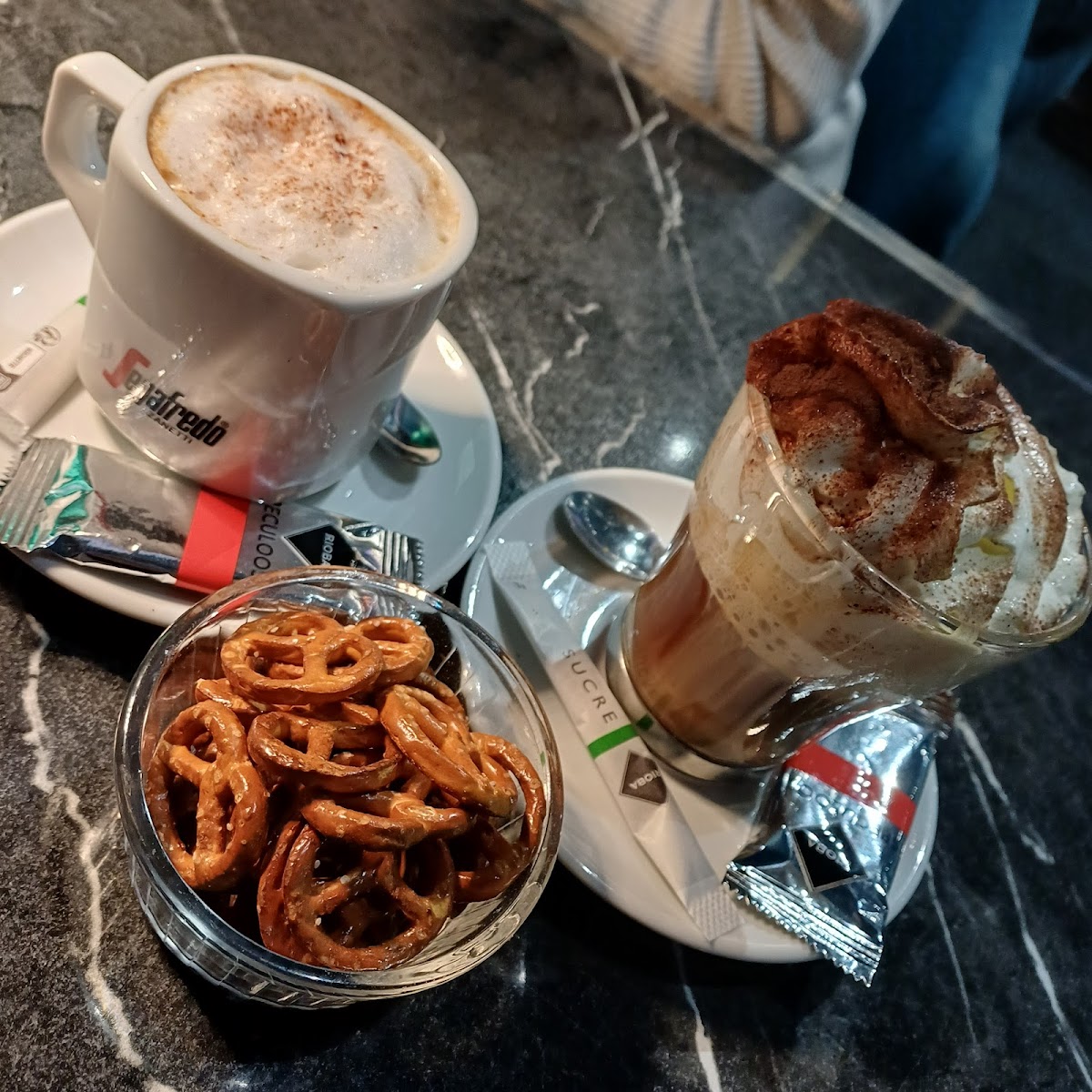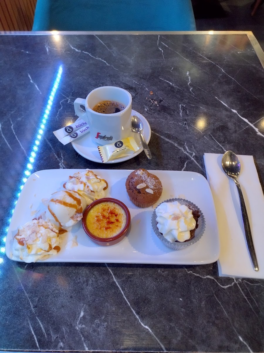 Delicious food, eclectic decor, and open late! We had a very delayed train into Strasbourg, so ended up arriving after most restaurants and groceries had already closed. I was so happy to see a restaurant still open just around the corner from our hotel. I ordered the shrimp penne with a side salad and my friend, who wasn't that hungry, ordered a blackberry kir and creme brulee. They gave us some pretzels and bread to start. We were caught off guard when they brought out our food since they also brought out some dry ice as part of the experience, which was very fun. As we'd been eating French cuisine for over a week, I really enjoyed the change of pace that the penne provided. My friend did not end up liking the blackberry flavor of her drink but did really enjoy her dessert. The decor inside is all a rich light blue color with some eclectic art pieces with pop culture elements like Monopoly and Looney Toons